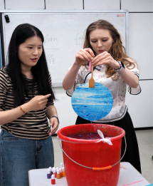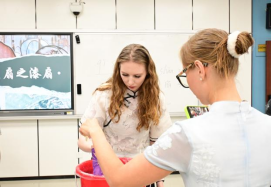 活动现场气氛温馨热烈。主讲教师黄雅琳、陈佳婧首先为留学生们详细讲解了漆扇的历史渊源、文化内涵及制作流程。这些介绍让在座的外籍友人惊叹不已,对即将开始的制作体验充满了期待。随后,在小组老师的示范与协助下,留学生们纷纷动手,从滴漆、调纹到转印、成型、晾干,每一步都做得有模有样。尽管不少学生是第一次接触漆扇制作,手法略显生疏,但大家热情高涨,互相交流帮助,现场笑语不断,其乐融融。